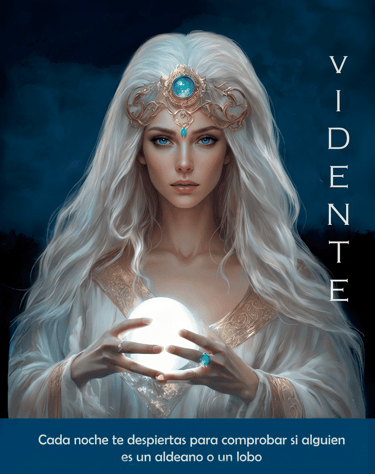 Pero si la vidente muere, tomarás su lugar: comenzarás a despertarte cada noche para investigar a un jugador, y el máster te revelará si es un aldeano, un lobo o ninguno de los dos.